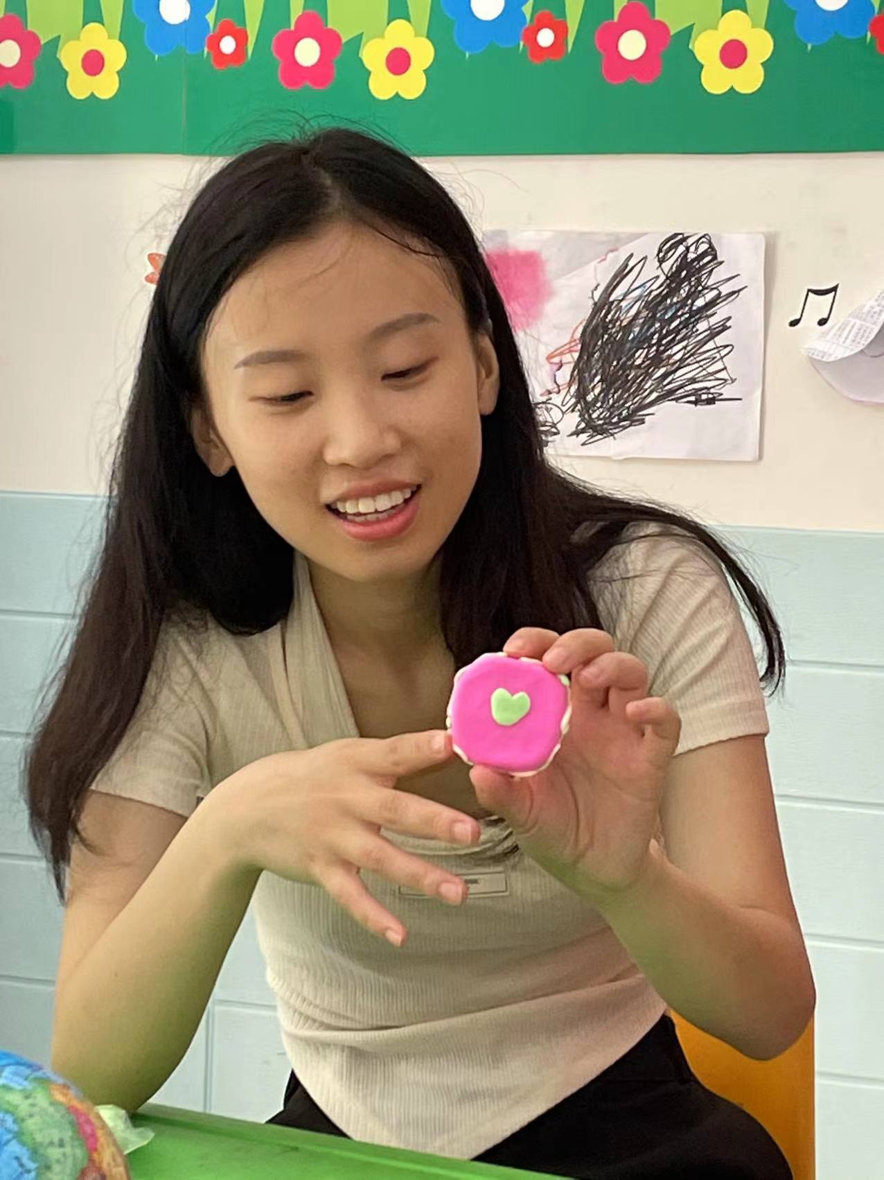 正式课程开始之前,小队成员周旋组织小朋友开展“你画我猜”小游戏,不仅活跃了课堂气氛,还激发了小朋友的学习热情。带着高涨的热情,小朋友们进入超轻粘土的课堂教学。活动伊始,小队成员李宇涵向小朋友讲解超轻粘土的使用方法并进行教学示范,随即小朋友跟着老师的演示,试着自己动手创作。创作过程中,小朋友互帮互助,互相当起了对方的小老师,通过自己天马行空的想象,最后创作出草莓、樱桃、小兔子、花篮等各式各样的作品。