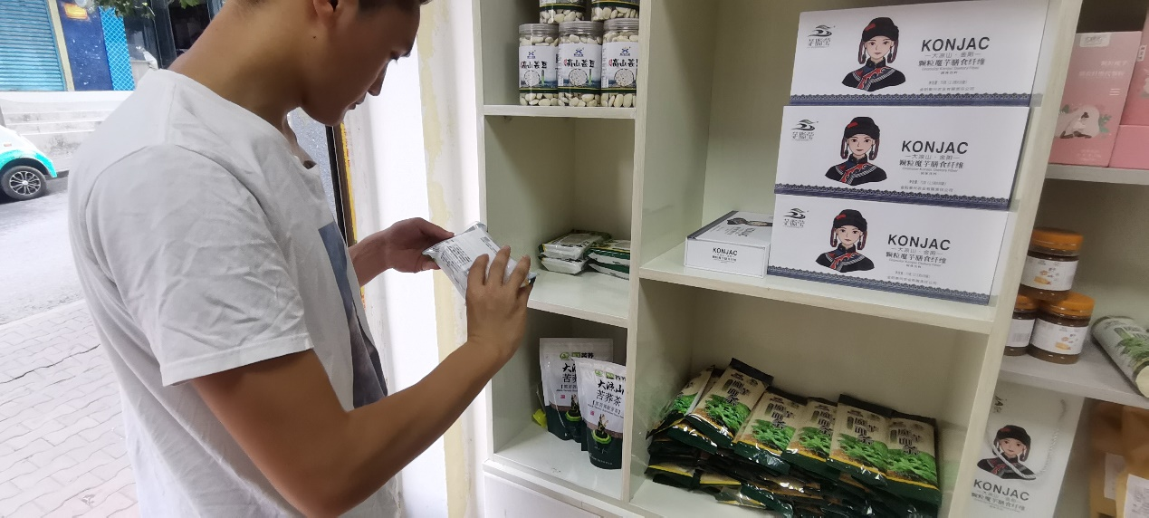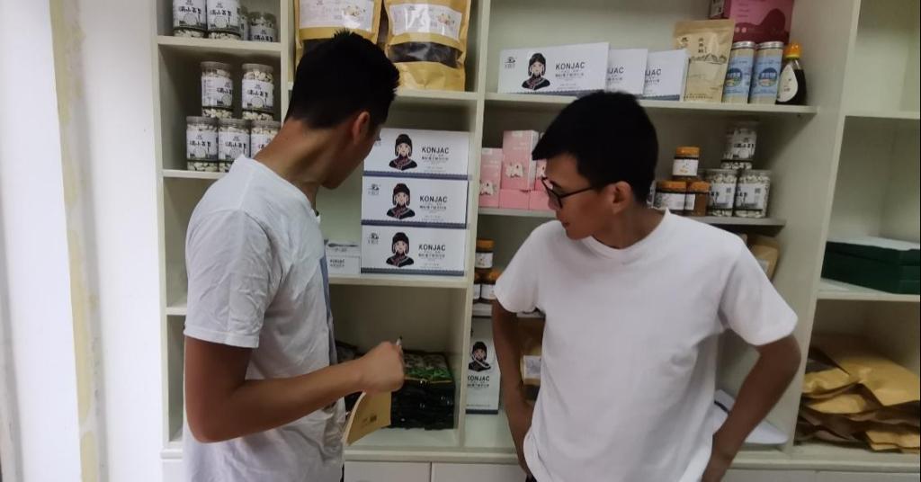 在团队成员和公司销售部经理的交流过程当中,经理详细地向团队成员介绍了公司对白魔芋种植农户的帮扶以及合作过程。经理谈到了公司的各种白魔芋产品的销售渠道和方向以及加工地点。经理说到:“我们公司和农户合作购入新鲜白魔芋之后,在大水沟加工产房进行加工,将其制作成高质量的魔芋精粉,再将精粉与外面的加工地联系起来,制作成各种白魔芋产品。”在泰兴农业公司里摆放着各类加工之后的产品,有白魔芋制成的洗面奶、化妆品、魔芋粉丝及面条等等。