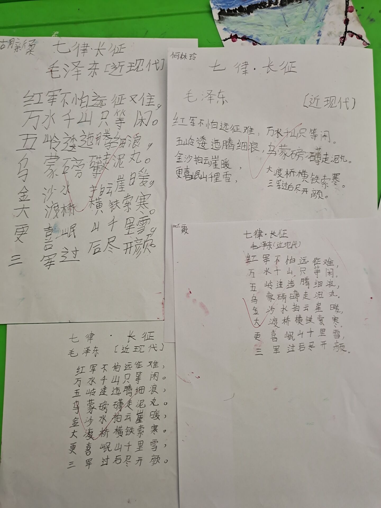 最后,星火小队带领小朋友学习了《七律·长征》,旨在帮助小朋友了解长征的全过程,进一步加深了小朋友对长征精神的理解。在小队成员李宇涵的讲解下,小朋友热情高涨,主动抄写甚至背诵全诗,朗朗书声萦绕整个教室。