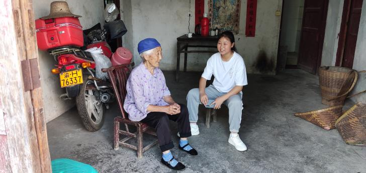 图为团队成员采访村民朱远凤 张茂芳/摄