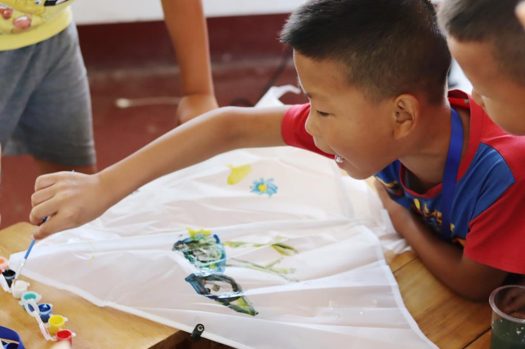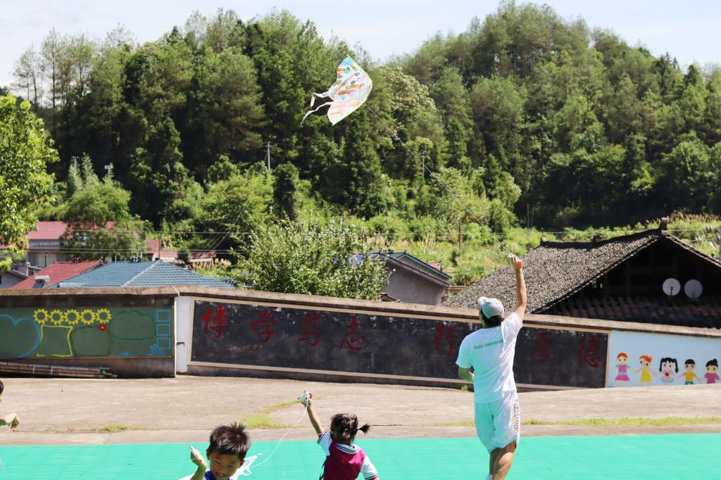 7月26日,在夏令营的第四日授课中,志愿者们紧扣“寻美家乡”和“景观”的主题,以童谣《大雨哗哗下》开启一天的课程;通过视频讲解和制作风筝,将孩子们的目光吸引到家乡景观上来,启发孩子们时时刻刻感触生活。后志愿者们带领孩子在操场上放飞风筝,尽管天气炎热,孩子们仍然自由奔跑,将快乐和风筝一同高扬。最后通过画团扇,引导孩子说出、画出自己最喜欢的景色,以笔墨描绘心中的美好。