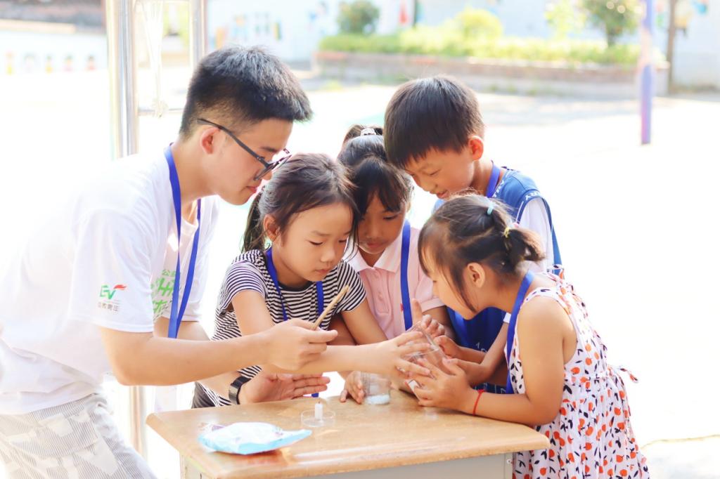 课程伊始,志愿者和孩子们一起跳营舞,旨在唤醒孩子们的身体。上午9:00小营的科学课程之旅正式开始。首先进行的是“隔空熄火实验”,利用柠檬酸和小苏打反应产生二氧化碳灭火,由于材料危险性较低,在志愿者的安全保护下,每个小组都亲手完成了一次实验,志愿者还以此为契机向孩子们介绍了二氧化碳灭火器以及一些常用的灭火方式。