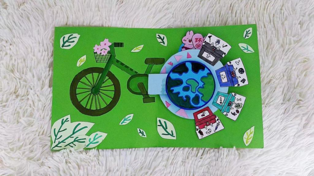 首先团队以垃圾分类为主题设计了环保文创,本次文创的内容是环保立体画。通过剪辑、粘贴各色卡纸,运用绘画工具,完成一幅以环保为主题的立体画。立体画整体是一辆自行车的形状,后轮由地球,以及四种不同分类的垃圾桶组成,自行车则代表人类。这寓意着垃圾分类带动地球运转,人类生活在地球上,得到了自然给予的各种资源,得以生存、繁衍,每个人都有保护环境的责任,应该尊重自然、爱护自然,为地球减负。本次实践活动,团队成员们亲自动手创作该文创,充分地认识到了垃圾分类的重要性。