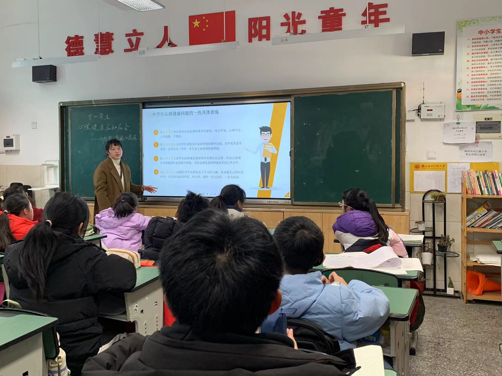为加强校园心理健康教育建设,帮助中小员工树立正确生命观、健康观、安全观,引导中小员工以正确方式方法提升自我素质,关注他人感受,2月5日,太阳成集团tyc234cc“向阳花·祖国小花朵”寒假社会实践分队在四川省德阳市沱江路小学六年级八班,开展“心理健康应知应会”心理健康讲座并取得圆满成功。