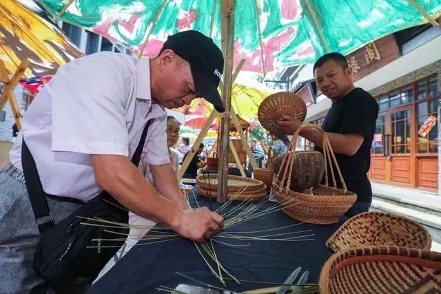 观看了竹编过程后,闫炳旭向手工艺人请教了这种技艺的精妙之处,并主动询问是否能够体验竹编产品的制作过程。在手工艺人的指导下,闫炳旭学习到一些趣味的竹编手法和技巧。他被这种以竹子为原料,经过挑、压、破、拼等编织手法使得竹编产品美观实用的技艺所触动。在竹编的经纬交错中,他不仅看到了精湛的技艺,更感受到其背后手艺人世世代代沉默的坚守。