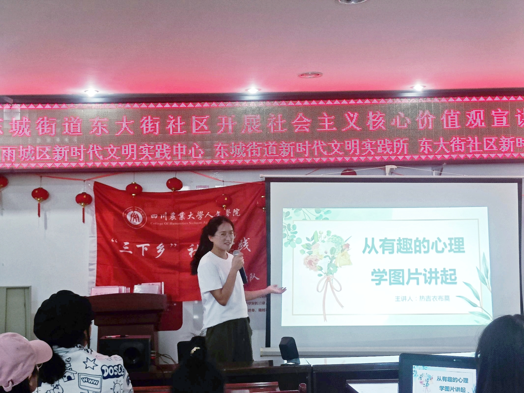 15:30,宣讲活动正式开始,团队成员热吉衣布莫通过几个视觉游戏吸引小朋友们的注意。她展示了“米勒·莱尔幻觉”等经典心理学照片,让小朋友们尝试找出图片中的隐藏信息或人物。最后,她向小朋友们解释了每个人对于同样的事物有不同的看法的原因。热吉衣布莫在宣讲中强调了心理健康对于个人幸福的重要性,并提出了积极的心理干预和自我调节的方法。