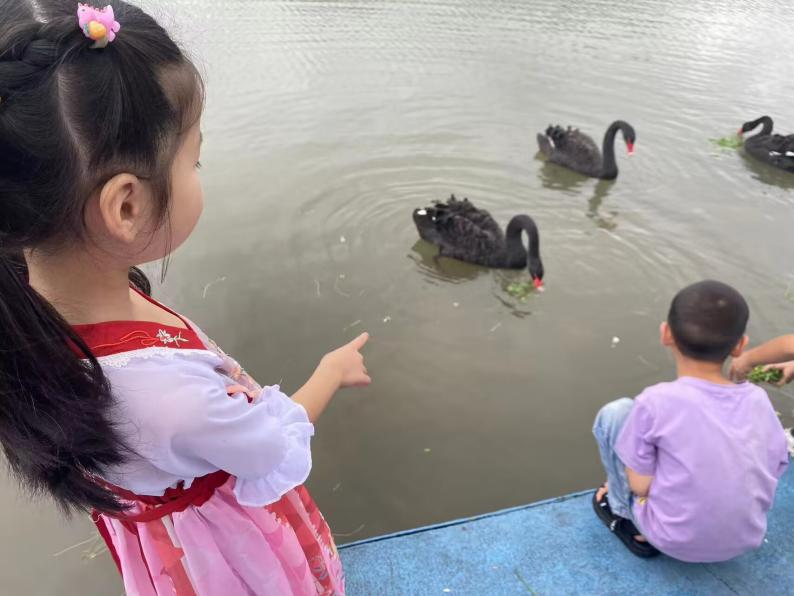 10:30,团队到达目的地,老师们引导员工开展自由活动。西奥队成员罗钦垚、朱芮瑶和邱雅暄带着一群孩子在湖边游玩。喂食黑天鹅、欣赏湖景、拍照等活动让孩子们情绪高昂,尤其是与黑天鹅亲密接触时,孩子们的热情更是达到高潮。在水城的活动让在孩子们增长自然知识的同时减轻了学习压力。