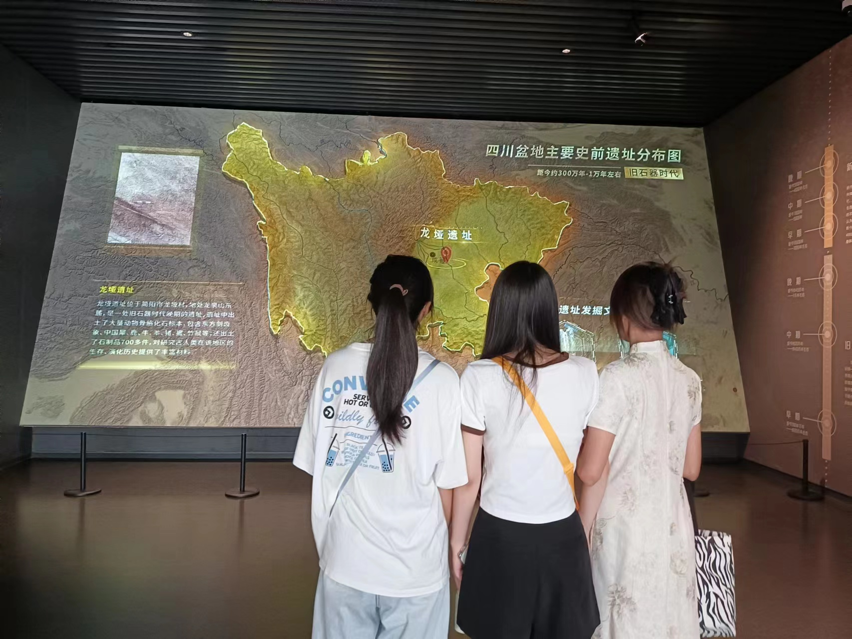 实践小队到达博物院后,分别参观了“远古四川”、“古代中国”以及“古代四川”三个常设展馆。远古四川展馆,将人类活动的历史追溯到了距今约200万年前以及旧石器时代早期。展馆内陈列了大量手斧与来自新旧石器时代的石器,向游客展示出远古时期人民的智慧与农耕生产力的发展。实践队员被馆内设有的电子触控屏所吸引,利用屏幕所展示的细节解说探讨对比远古农耕工具的差异,增加了实践活动的趣味性。
