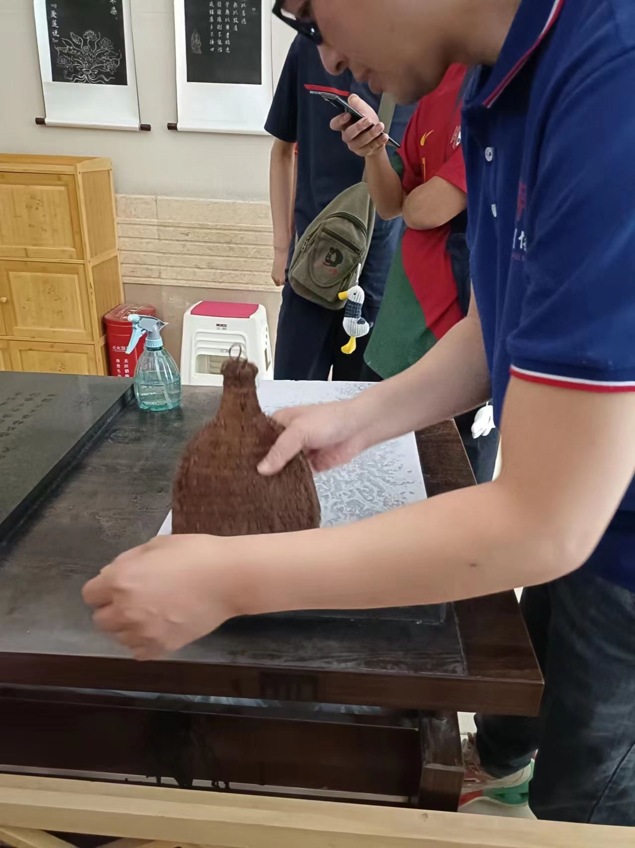 博物院在文创区设有非遗古法拓印技术体验区,工作人员向游客展示了传统非遗拓印的流程,吸引了一大批对此感兴趣的小朋友驻足观看。拓印,旧时也称蝉蜕术,是中国古代最早出现的一种特殊的印刷技术。小队队员荆雨晴在工作人员的指导下尝试制作了金“福”的拓印,看着自己初次体验后的成品,她感叹说:“当时古人保留文献的技术已经很完善精湛了,为中华优秀传统文化的传承和考古研究奠定基础。”