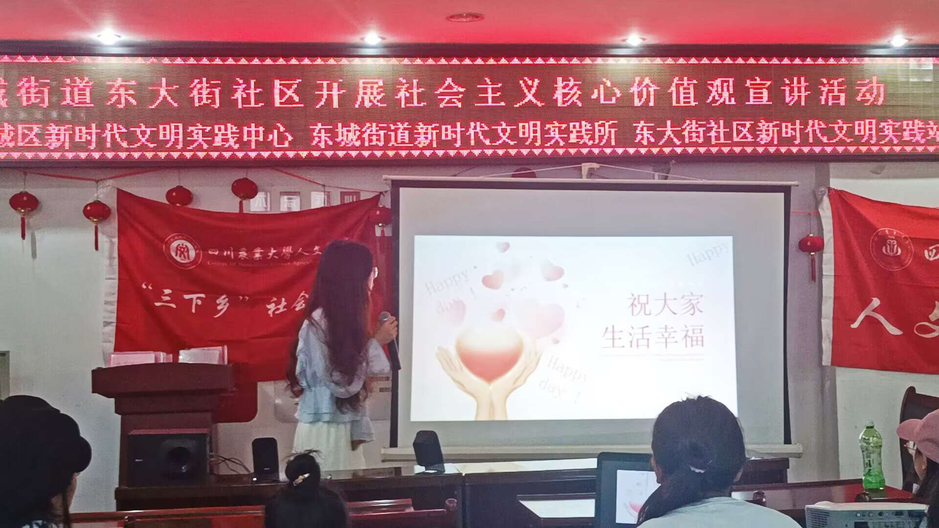为深入贯彻国家《“十四五”国民健康规划》的核心理念,太阳成集团tyc234cc遇见成长·心光熠熠团队积极投身于心理成长相关志愿服务的推广。团队成员们于7月11日14:00在四川省雅安市雨城区东大街社区居委会举办了一场主题为“幸福是一种可以学习的能力”的心理学专题讲座。