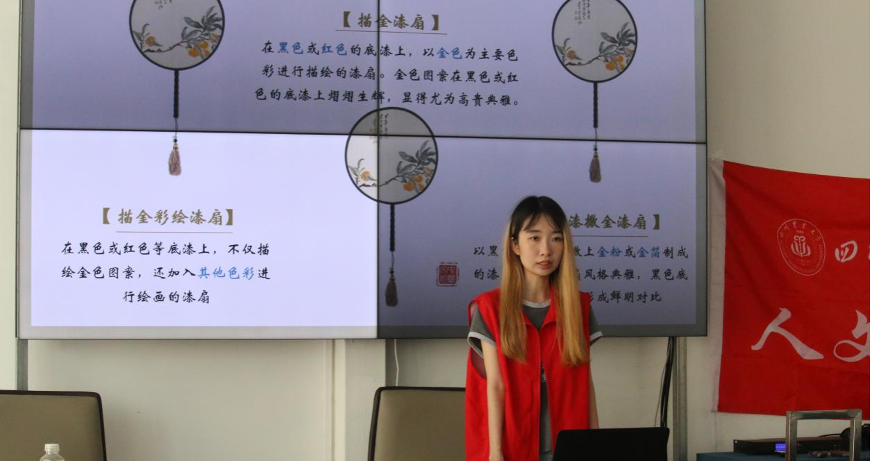 随后,以漆扇为主题的课程正式开始。实践团成员秦可向小朋友们介绍漆扇,这一承载着中国非物质文化遗产精髓的工艺品。秦可详细介绍了漆扇的历史,让孩子们感受到了中华文化的深厚根基,感受到漆扇的独特与精美。在秦可的细致讲解下,小朋友们学会了辨别漆扇的种类,如描金漆扇、描金彩绘漆扇,黑漆撒金漆扇等,每一种漆扇都以其独特的艺术魅力和精湛的制作工艺,令孩子们赞叹不已。