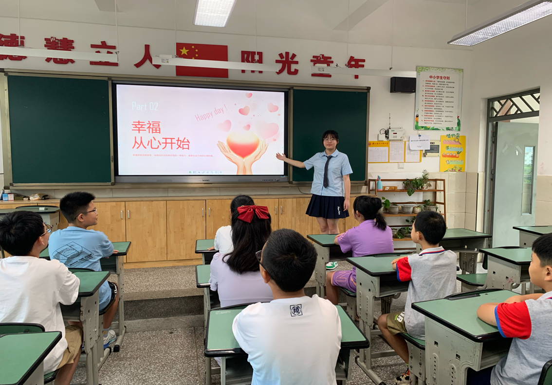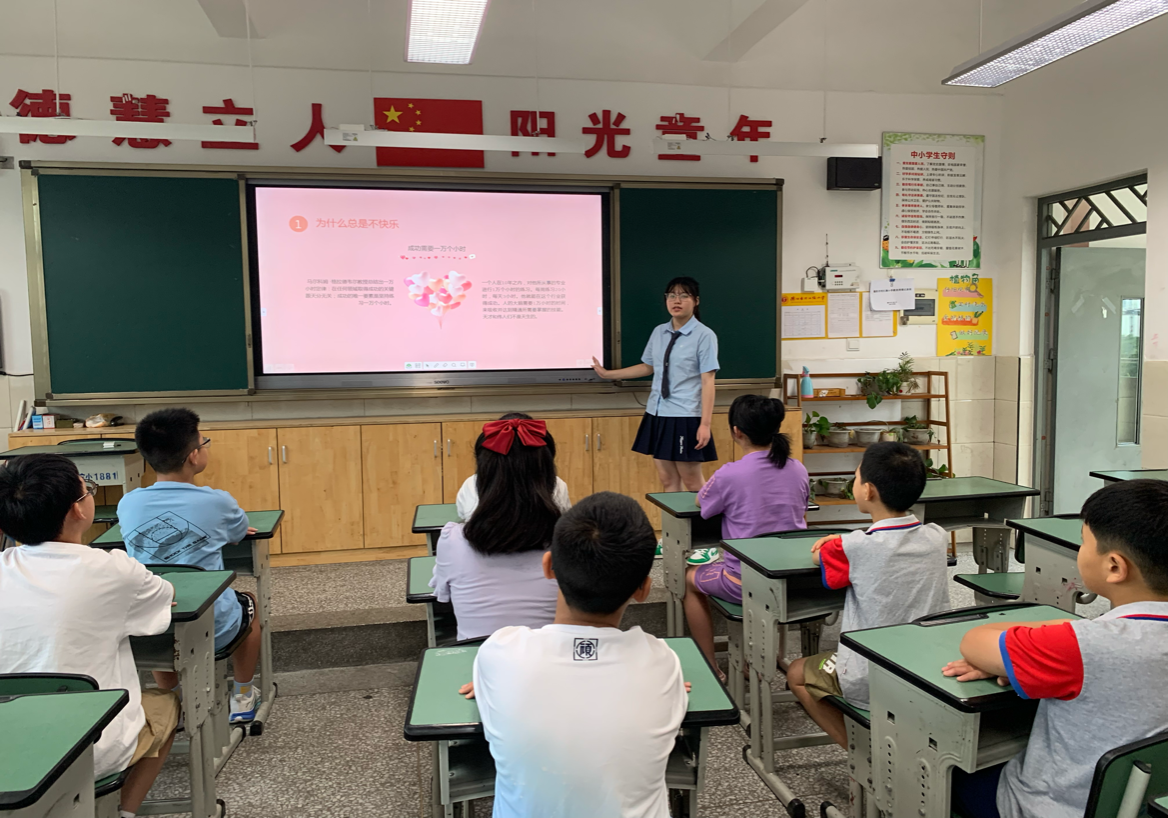 8月10日,小队成员前往沱江路小学五年级四班为同学们带来了一场主题为“幸福是一种可以学习的能力”的心理健康讲座。