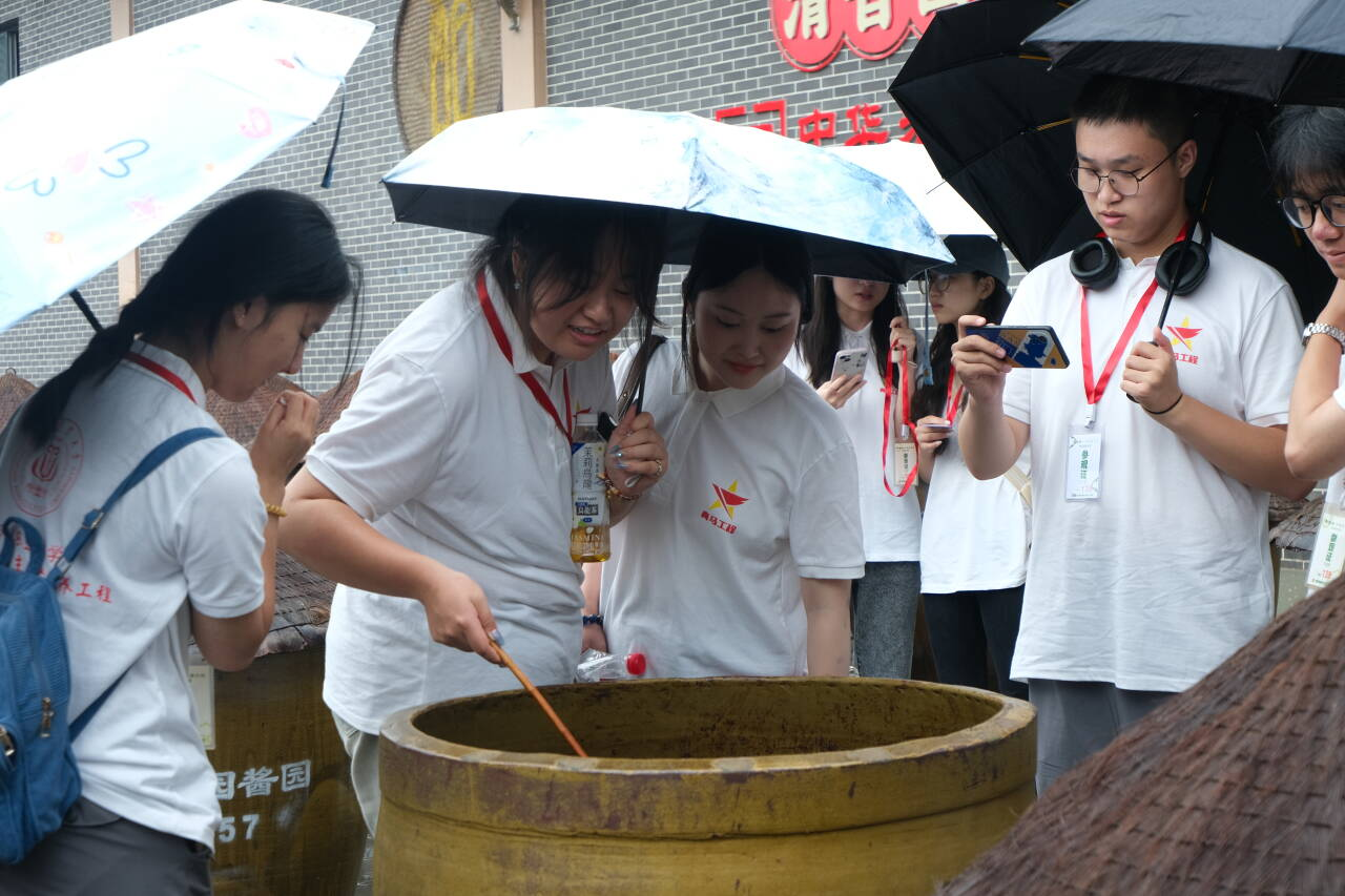 7月20日10:00,实践小队成员于江油站集合,出发前往清香园进行实地参观。小队成员们走进园区,制作原料香气扑鼻,映入眼帘的是陈列的酱缸,还有一些制作工艺的书籍。随后小队成员进入酱园,讲解员耐心为队员们讲解酱油的制作流程,团队成员纷纷认真用手机记录。“制作的工艺十分神奇,以前只是在商场购买已经制作好的调味料,从未实地走访园区,参观制作流程,还是感觉十分震撼。”小队成员刘家乐在观看酱油制作工艺后感叹道。