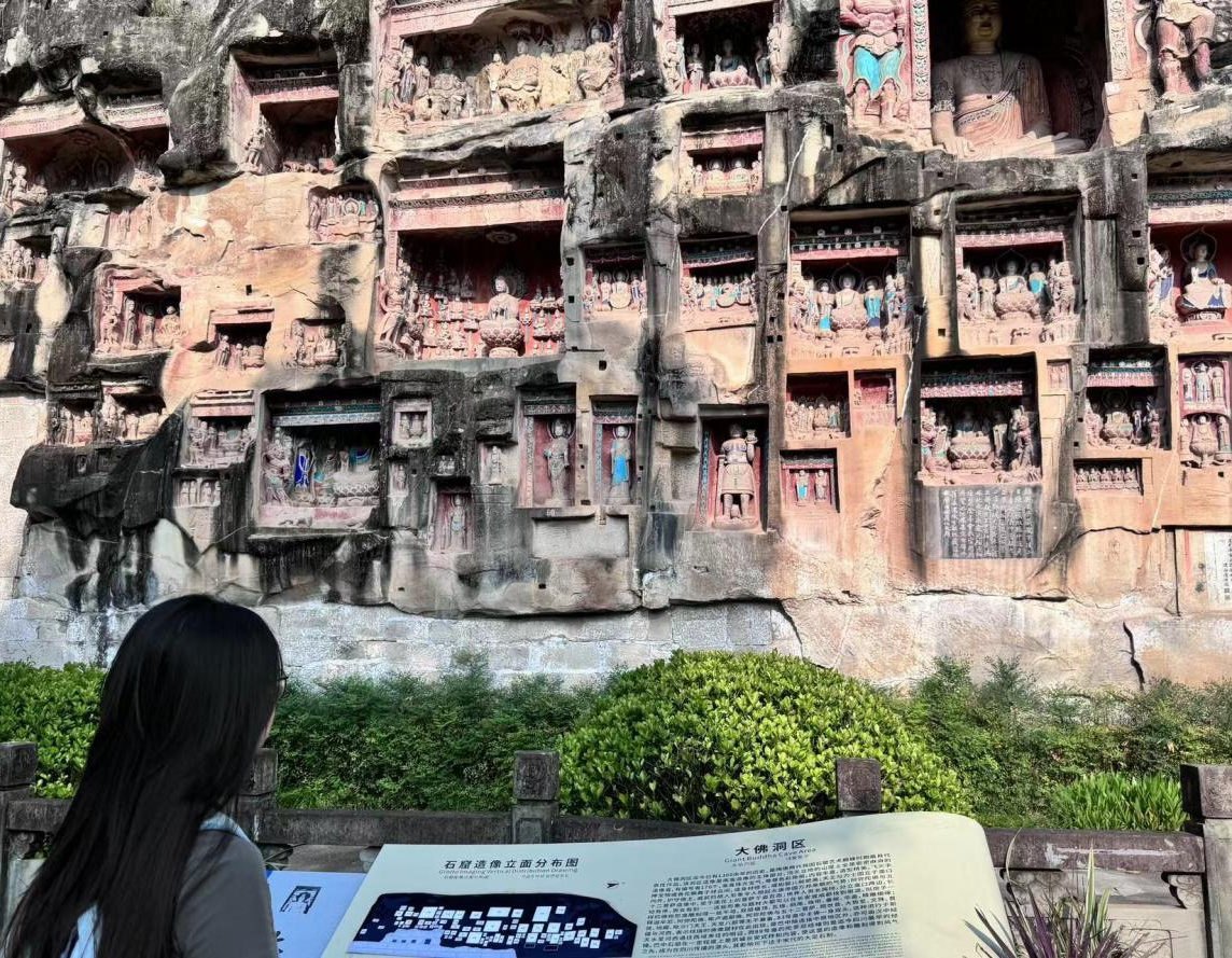 随后,团队成员在讲解员的带领下,穿梭于石窟之间,品味每一处细节。从雄伟的主佛像到细腻的飞天壁画,从庄严的佛教故事到生动的生活场景,南龛石窟的艺术之美令人叹为观止。其中给团队成员留下最深刻印象的是大佛洞区,其最为密集,上下达5层之多,大窟小龛,前佛后佛,密如蜂房,雕嵌玲珑,规模宏大。团队成员感受到了南龛石窟不仅是无价的艺术瑰宝,更是至关重要的研究资料。同时,团队成员也体会到了保护这一重要佛教艺术遗址的必要性和重要性。