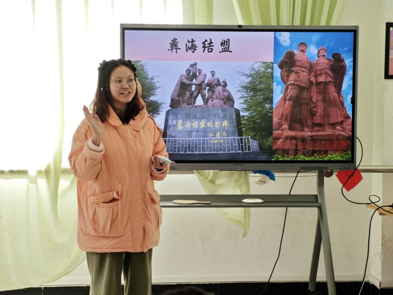 随后,队员吉子拉作结合讲解和互动环节,向小朋友们提问“彝海结盟”的历史背景、雕塑建造时间等相关历史问题,小朋友们也积极回应。她说道:“‘彝海结盟’是红军长征途中的一次重要事件,它不仅展现了红军与彝族人民之间的深厚友谊,更体现了中国共产党团结各族人民共同抗日的坚定决心。”通过这次红色文化进课堂活动,小朋友们深刻体会到革命先烈的英勇无畏和伟大牺牲,纷纷表示要继承和发扬这种不怕困难、勇于斗争的伟大革命精神。