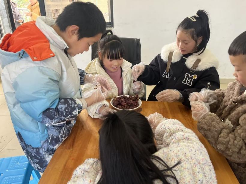 毛睿一老师的山药糕制作手工课深受欢迎。孩子们戴上手套,动手给山药剥皮、揉泥,制作枣泥馅,两两合作在老师指导下完成山药糕制作,还品尝到自己的劳动成果。