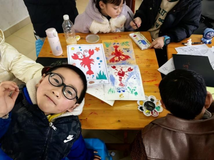 上午,支教团队队长勾娅红首先为孩子们带来吹塑纸版画制作课程。她先分发材料,随后详细讲解绘制方法,孩子们两人一组分工合作,在泡沫板上画线条、涂颜料、印卡纸,最后展示评比,新颖的绘画方式锻炼了孩子们的动手能力。