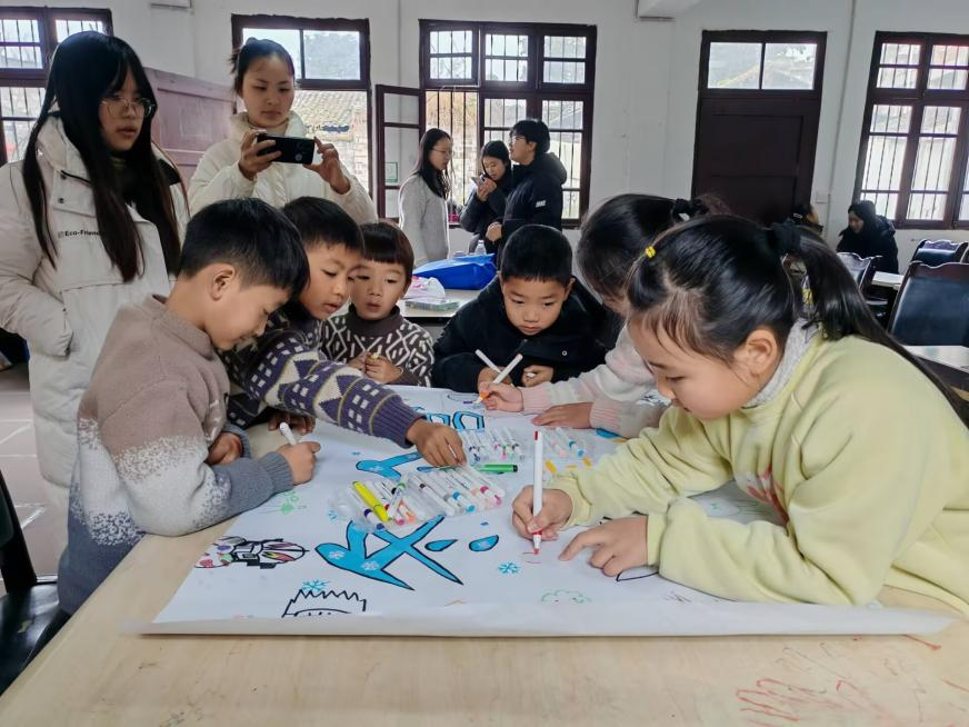 随后,老师带领孩子们开展了手工绘画课程,孩子们的学习兴趣都很浓厚。特别是到讲解“甲骨文”课程环节,通过队员们的趣味讲解,孩子们参与度很高,成功在孩子们心中种下了一颗热爱传统文化的种子,达到了团队预期的效果。