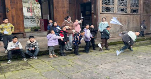 趣味音乐课的第二个环节是“歌声伴纸飞机放飞梦想”。孩子们充分发挥自己的想象力和动手能力制作了形状多样、风格各异的纸飞机。随后,在小队成员的引导下,小朋友们在纸飞机上面写下各自的心愿或烦恼。队员们发现,即使在孩童时期,孩子们都有属于自己的成长的烦恼与心愿。随后,孩子们来到文化站的院子里站成一排,伴着欢快的音乐声放飞纸飞机。放飞纸飞机的过程中,每个孩子们眼里都带着光,脸上洋溢着灿烂的笑容。放飞纸飞机的有趣形式帮助孩子们疏解了烦恼情绪,保持健康的心理状态。