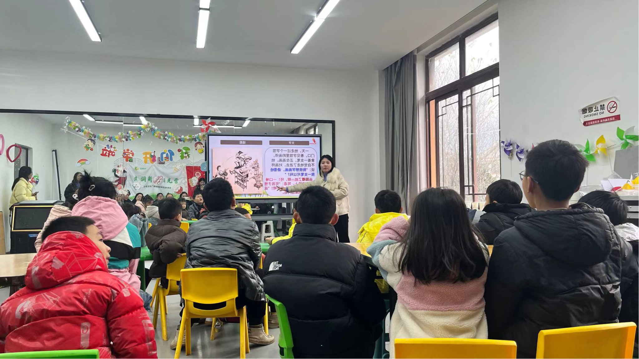 8:40,志愿者们带着小朋友们做完早操后,由小队成员加潘阿牛木展开此次活动的第一堂课。课堂伊始,主讲人首先向小朋友们展示了提前用卡纸和扭扭棒做成的手工并讲解了手工制作流程和注意事项。小朋友们认真学习后,便开始积极展开属于自己的手工品的制作。在主讲人的指导下,每一个小朋友都收获了独属于自己的手工品。随后,雅安市第三届小学语文名师工作坊的老师为孩子们带来了一堂以《神笔马良》为主题的阅读推广课并在课上不断启发小朋友们的深入思考,激发了小朋友们的想象力和对阅读的兴趣。