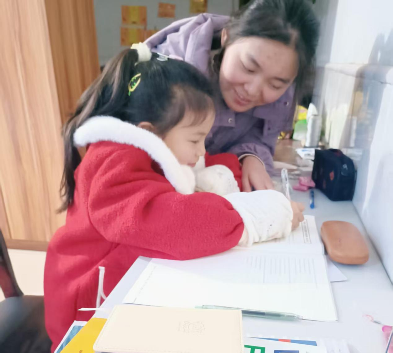 接着,在辅导英语寒假作业时,队员针对单词拼写,引导小女孩结合生活实物联想记忆,看到书包就能说出 “schoolbag”;对于句型,队员给出清晰例句,让她替换关键词模仿练习。遇到难懂知识点,队员巧妙融入生活场景对话,帮她轻松攻克。一段时间后,小女孩取得较大进步。她兴奋地说:“以前写作业错很多,现在容易多了,好多知识都想起来了!”