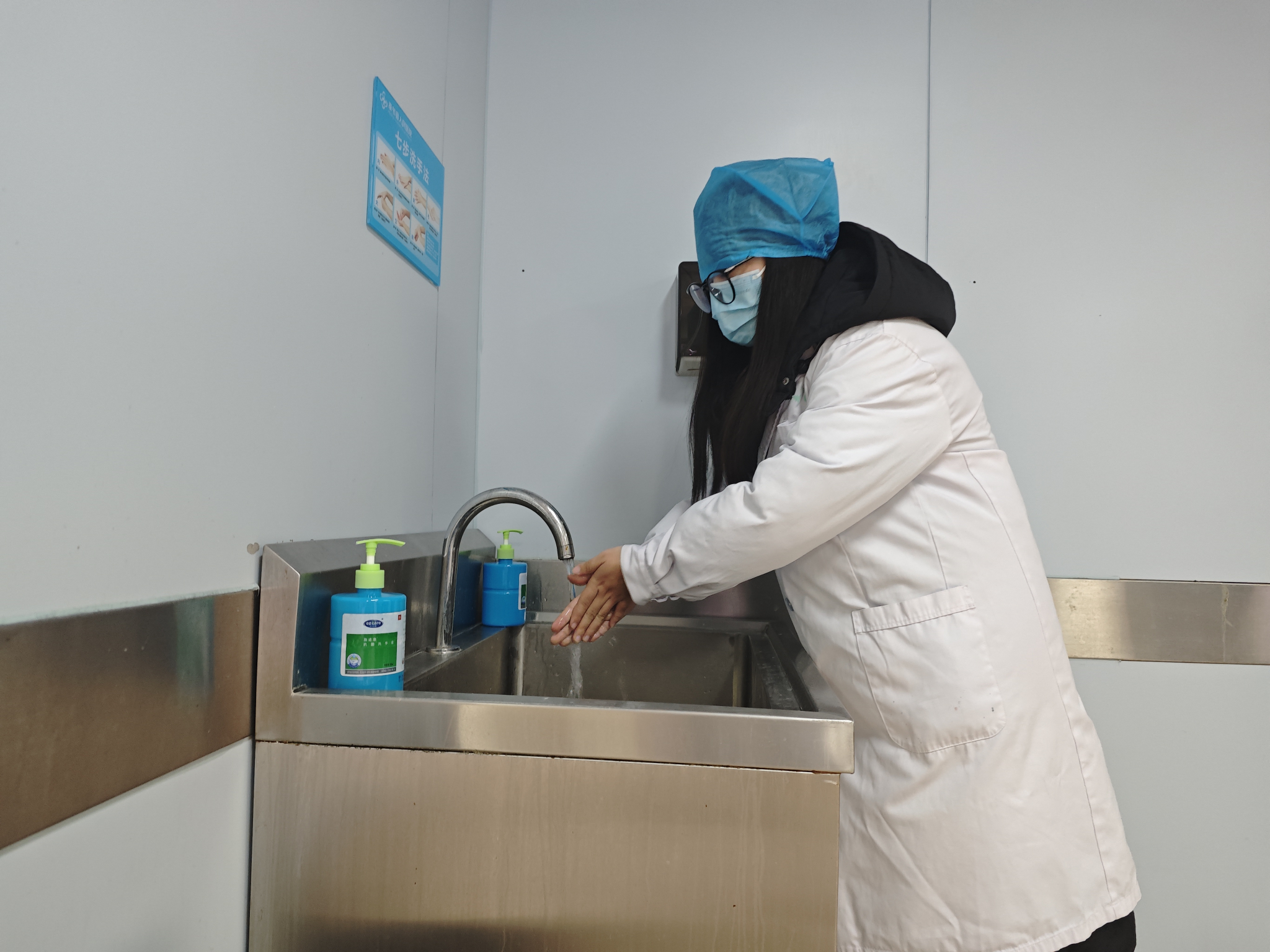 为了进一步体验医生们的工作,小队队员穿上医生工作服亲身体验,深入感受其工作环境。由于医疗工作的特殊性,消毒清理十分重要。在办公处一旁均设有洗手点,队员在医护人员的指引下,学习了七步洗手法,储备了基本医护知识与技能,并跟随医生视察病房,眼观耳听间,感受到了医生专业的理论与实践储备及其对病人的爱护与关心。
