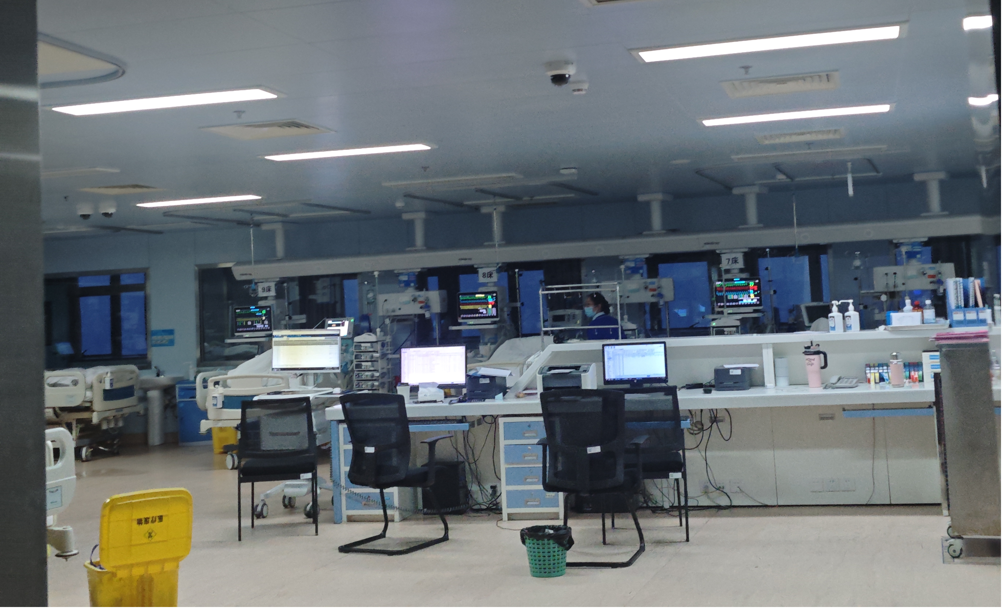 接着,队员重点参观了某科室医生办公室。医生办公的地方和病床直接相连,各处都是医疗设备,上面反映着患者的各项生命体征,方便医生随时监测患者情况和必要时进行抢救。虽时间尚早,但医生们早就开始处理自己的工作,繁忙而有序的看诊安排在显示屏上重点提醒,方便患者及时反映医生问诊安排。