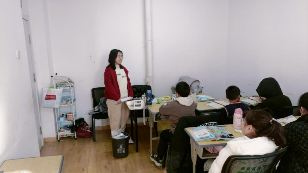 活动伊始,实践队员马玉萌充分发挥自身专业优势,根据补习班员工的年龄和英语基础,精心设计了教学方案。课堂采用多样化的教学方法,通过生动有趣的英语儿歌、活泼的情景对话以及互动游戏,营造出轻松愉快的学习氛围,迅速吸引了孩子们的注意力。