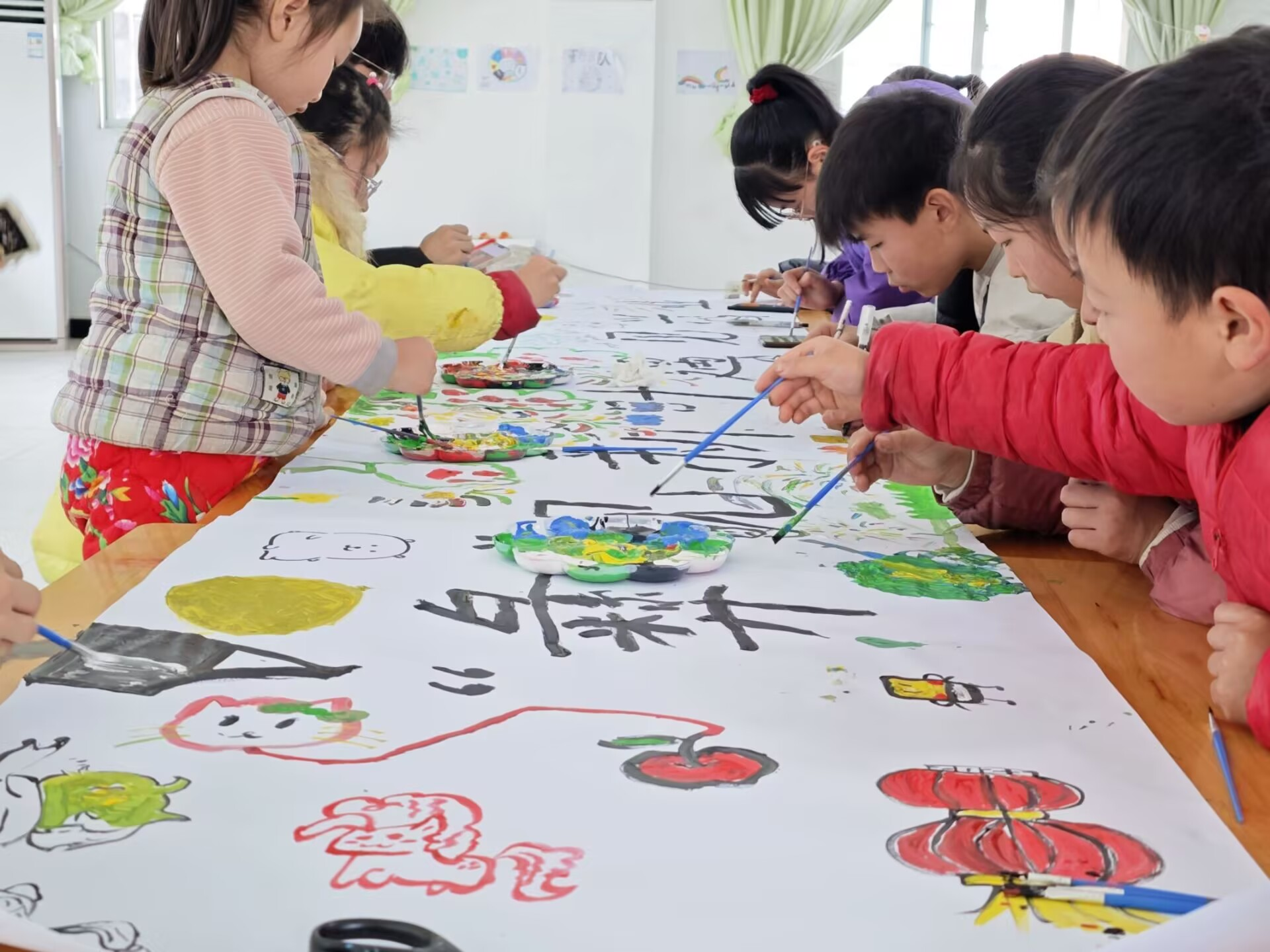 接着,全体师生共同参与创作了一幅手绘画卷。大家围在一起,手持画笔,认真地描绘着心中的美好。画卷上,有绚丽的色彩、可爱的图案,更有师生们共同留下的签名与印记,它象征着这段特殊时光里建立起的深厚情感与珍贵回忆。