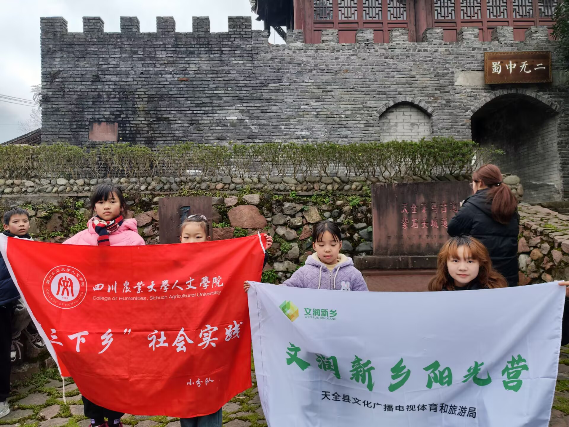 活动伊始,实践队员带领 小朋友们走上茶马古道,并在途中化身讲解员,结合茶马古道的历史变迁和文化内涵,为小朋友们详细介绍了茶马古道的起源、发展以及在古代经济文化交流中的重要作用。小朋友们认真聆听,不时提出问题,对于家乡的茶马古道文化充满了好奇。随后,队员们带领小朋友们沿着茶马古道遗址继续前行来到了紫石关城遗址,天德茶炕遗存犹在于此,楼门之上“蜀中无二”的题牌更是醒目。紫石关城遗址位于雅安天全县,作为茶马古道上的重要节点,见证了昔日商贸往来的繁荣,承载着千年的历史记忆。