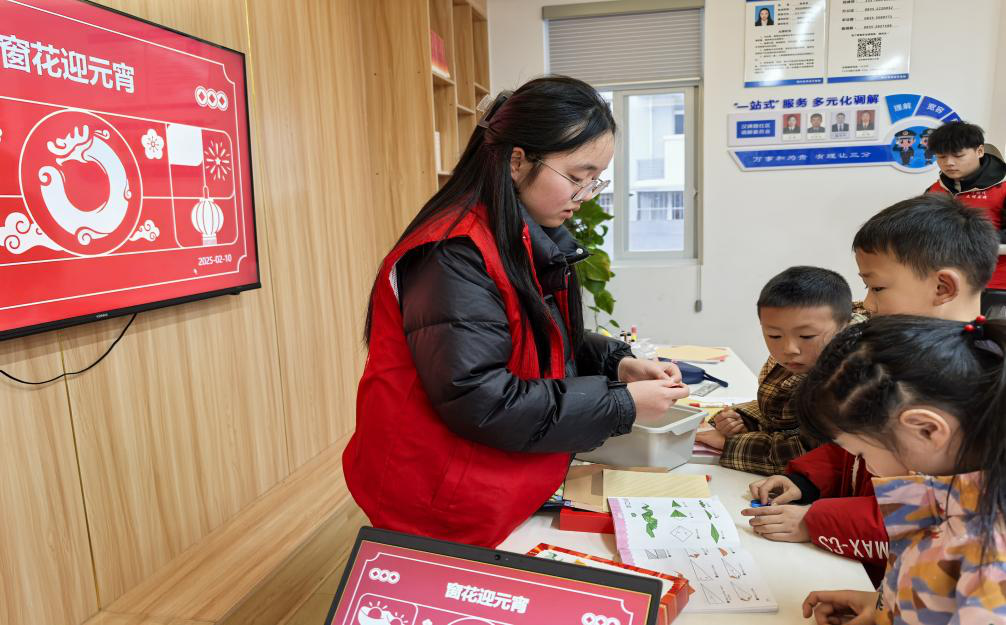 15:00,开始了本次冬令营活动第一堂课。第一堂课的主题是“巧手绘春节”,旨在让小朋友们通过亲身体会走进春节。小队成员首先介绍了春节的相关知识,然后在白板上展示了一些简单易学的简笔画素材,再分发工具让小朋友们亲手实践。第一堂课接近末尾,小朋友们都用多彩绚丽的图画描绘出了心中的春节。随后,本次夏令营第二堂课开始,第二堂课的主题是“窗花迎新年”,小队队员首先为小朋友们讲解了窗花种类及应用,并向小朋友们展示了窗花的制作过程。最后,小队成员分发材料让小朋友们在动手创作当中体会这一方窗花当中的创意无限。