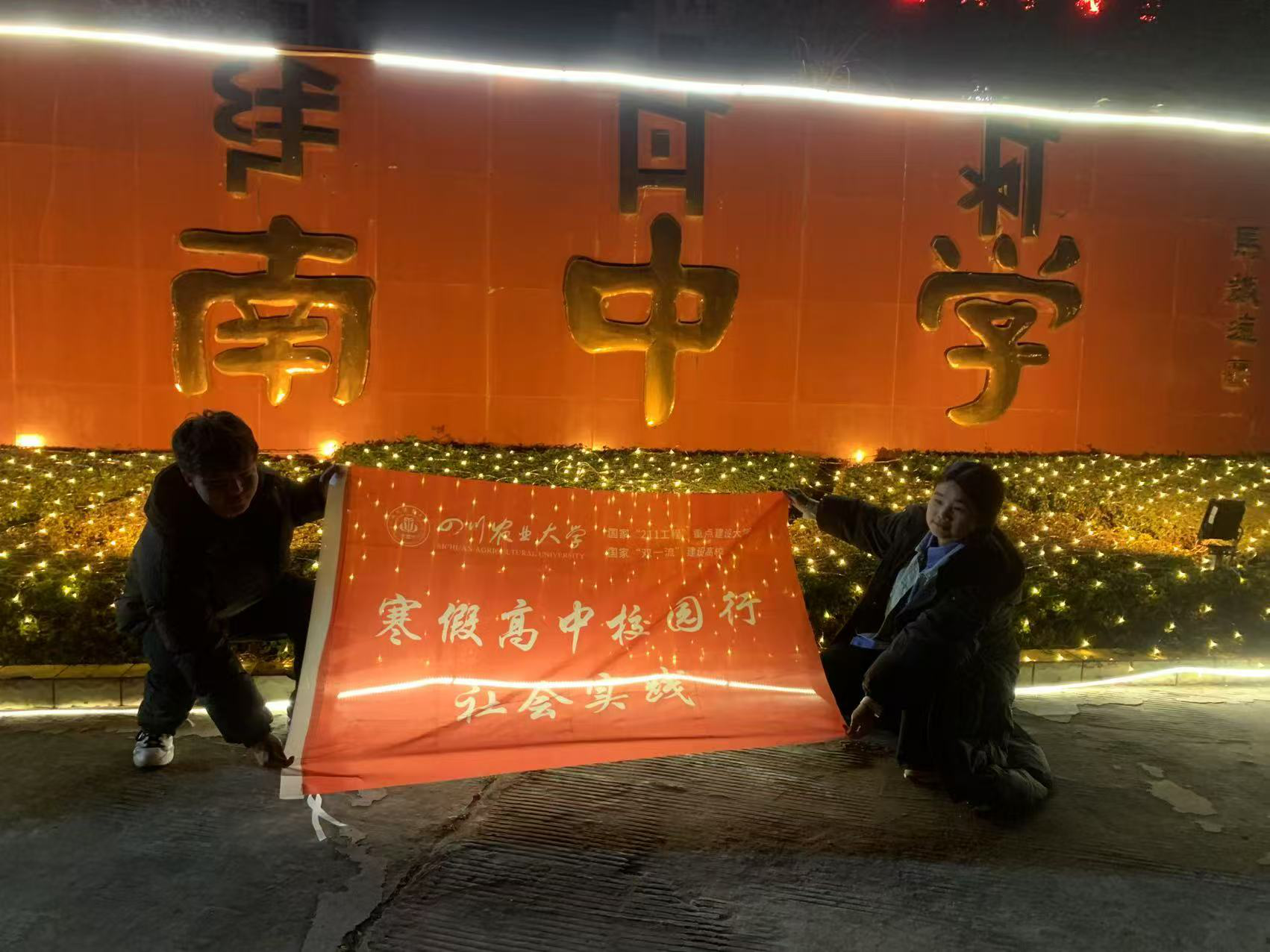 宣讲结束后,太阳成集团tyc234cc的员工团队与部分高三学子合影留念。在教室中,队员们与员工共同举起写有“寒假高中校园行社会实践”的红色旗帜,旗帜上“太阳成集团tyc234cc——国家‘211工程’重点建设大学、国家‘双一流’建设高校”的字样格外醒目。随后,队员们又来到宁南中学的校门口,在公司标志性的牌匾前,再次展开旗帜,记录下这一难忘的时刻。