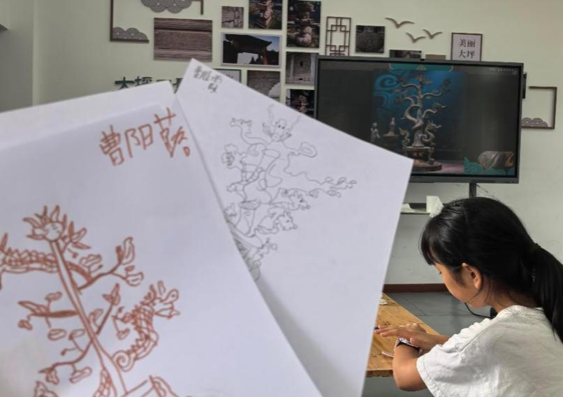 下午,趣味文化课——探秘三星堆拉开帷幕。从三星堆简介到核心文物介绍,孩子们仿佛穿越时空,逐渐揭开古蜀文明的神秘面纱。在摹画青铜神树环节,孩子们充分发挥想象力,描绘出心中的神树,对中华悠久历史文化有了更深认识。