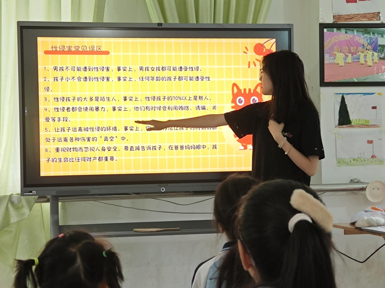 性教育课堂上,队员们通过卡通动画和情景模拟,以“身体红绿灯”为隐喻,向孩子们讲解隐私部位的保护知识。在讲解中,孩子们掌握了“拒绝-离开-告知”的自我保护三步法,并且更好地了解了常见误区及保护自己的方法,将安全知识内化为自我保护的本能。队员杨鑫茹感慨:“这堂课让孩子们学会了用正确方式保护自己,比任何礼物都珍贵。”