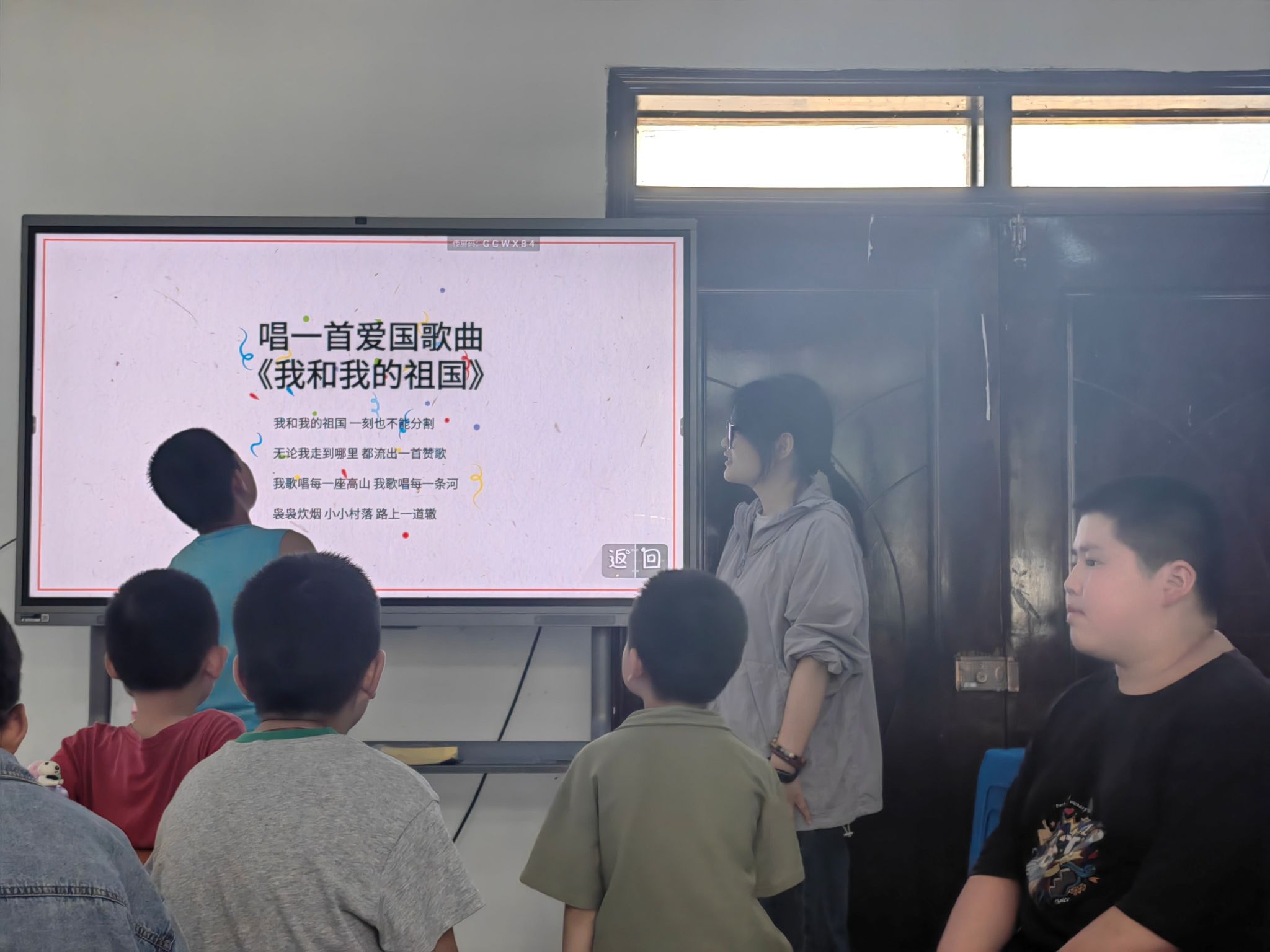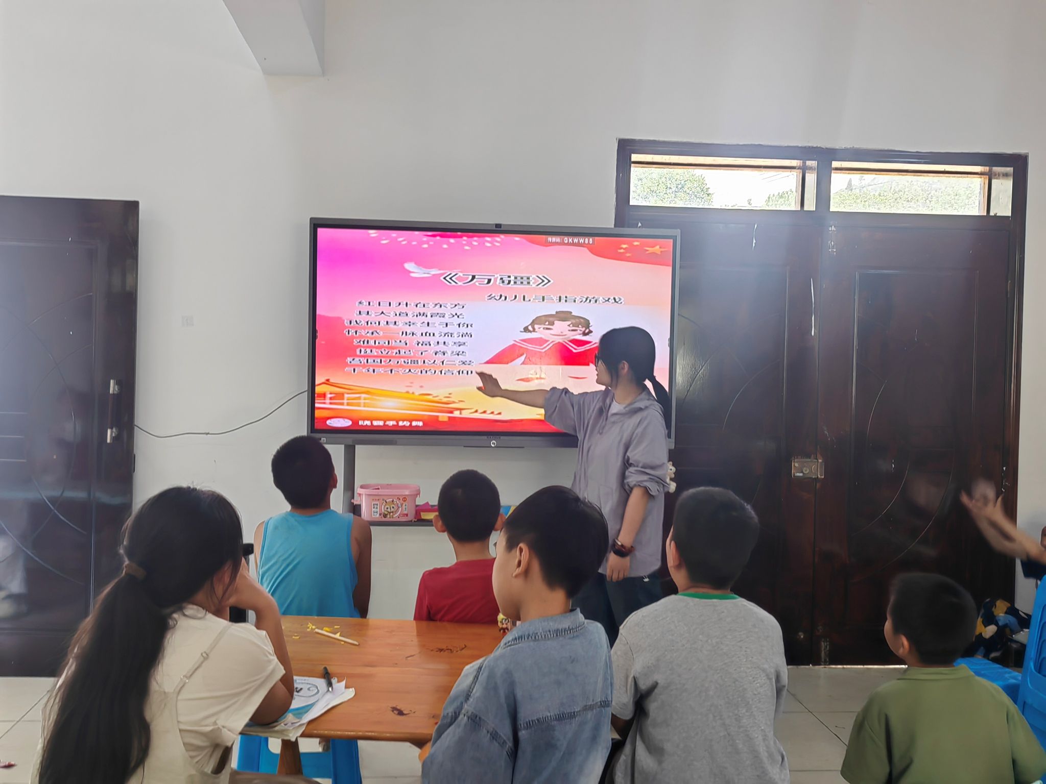 9:00,为帮助孩子们树立正确的民族观和国家观,团队设计了红色歌舞的学习课程。歌舞教学板块分为"红歌传唱"和"红色舞蹈"两个单元。团队选取《我和我的祖国》这一经典曲目,通过教唱、合唱、表演唱等形式开展教学。在舞蹈教学中,团队将革命故事融入舞蹈编排,选取了歌曲《万疆》的片段为音乐,教孩子们学习了一段手势舞蹈。这种寓教于乐的教学方式让孩子们深刻感受到了祖国的伟大,为孩子们提供了精神坐标。