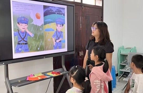14:00,团队成员祁诗然精选了《小英雄王二小》、《闪闪的红星》和《鸡毛信》等经典红色绘本,以“图文共读+情景演绎”的方式展开。小队成员提前研读绘本历史背景,设计互动环节,通过角色扮演这一寓教于乐的形式帮助孩子们沉浸式理解故事内涵。每一篇绘本分享结束后,团队成员以故事里的真实历史为切入点,继续延伸讲述绘本背后的革命事件。在《小英雄王二小》的共读环节,小队成员以情景剧再现小英雄机智引敌的壮举,孩子们踊跃参与讨论,现场气氛活跃。