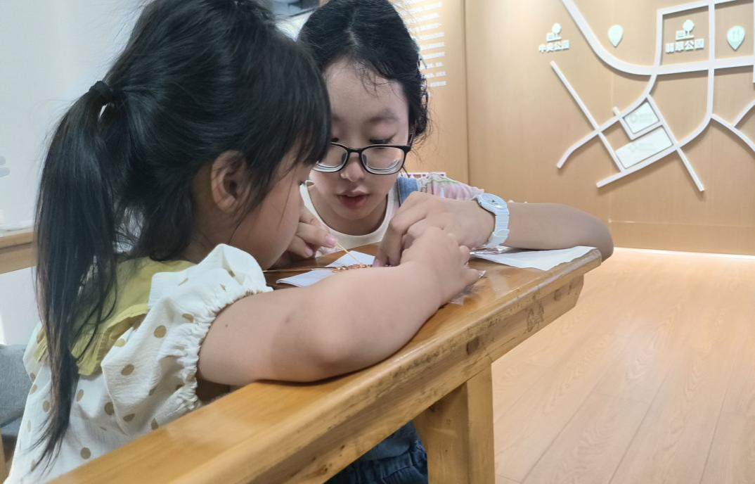 最后进入指尖生花・亲实践环节。参与者以 “螺钿书签” 为实操载体,使用预制首饰底材与贝壳碎片自由设计简单纹样。团队成员巡回指导,重点辅助调整拼贴角度,奉行“贝壳的弧度里,藏着你独有巧思”的理念。社区儿童积极参与,自主运用配色,最大程度发挥创意,在亲手制作中感受螺钿技艺的乐趣与传统文化的韵味,在配色与构图中尽情释放创意,让一片片贝壳在指尖绽放出别样光彩。