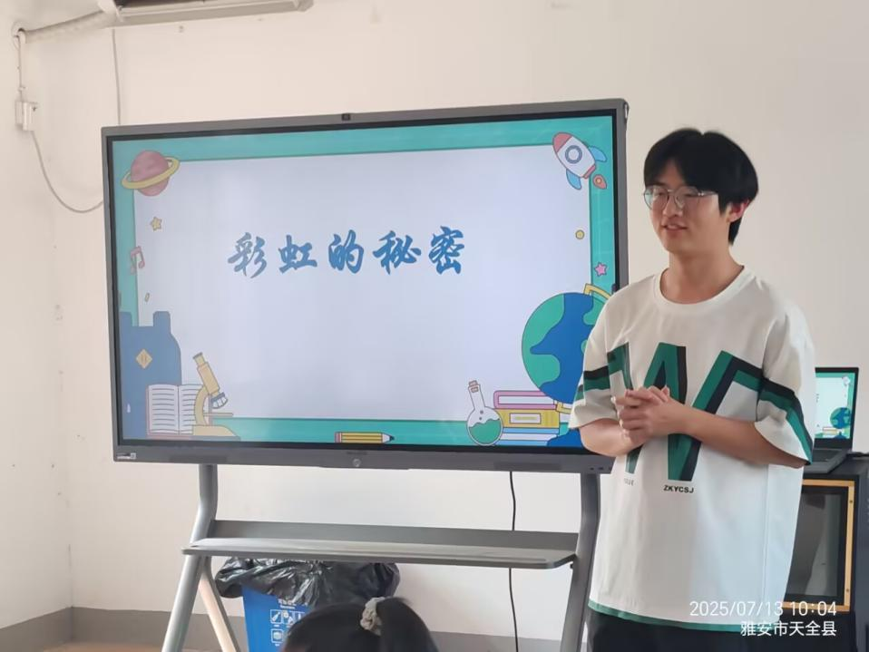 在上午的“玩转七巧板”课程上,小队成员陈玉娇凭借生动讲解,将七巧板的奇妙之处展现得淋漓尽致。在队员们的协助下,孩子们兴致勃勃地动手实操,于拼搭中锻炼空间思维与创造力。紧随其后的“彩虹的秘密”课程里,小队成员吴宇豪深入剖析彩虹形成原理,还绘声绘色地讲述了与之相关的文化故事。孩子们沉浸其中,既掌握了科学知识,又感受到了文化魅力。