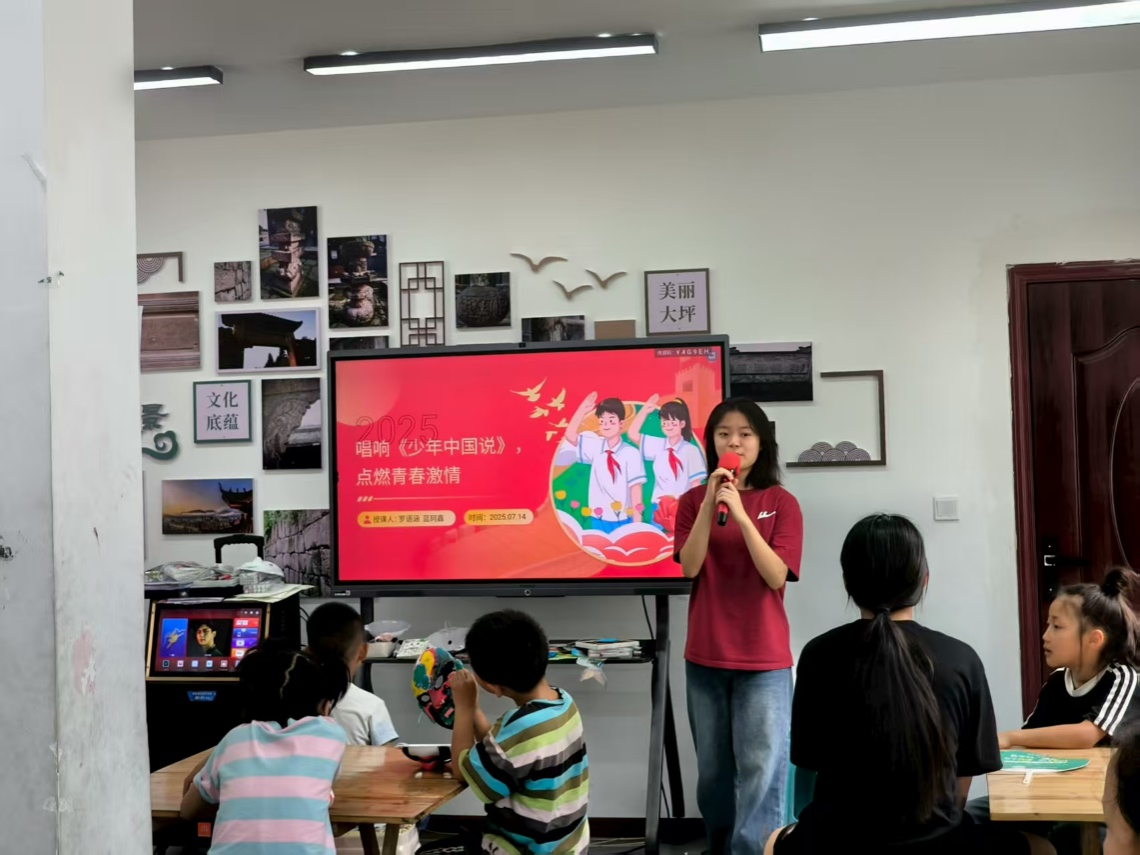 下午的《少年中国说》咏唱课则点燃了孩子们的热血豪情。志愿者先讲述梁启超在民族危亡之际写下此文的背景,当《少年中国说》的激昂旋律响起,孩子们眼中闪烁着光芒。逐句学唱时,志愿者耐心纠正发音,带领大家体会“少年强则国强”的壮志;全班大合唱环节,稚嫩却坚定的歌声回荡在教室,孩子们在歌声中读懂了责任与担当。
