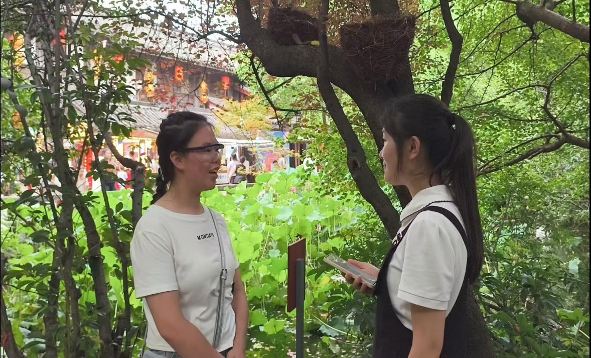 在古街走访过程中,团队随机访谈了几名游客。来自陕西的游客王先生表示:“锦里的三国文化氛围很浓,三义庙的碑刻和讲解让孩子直观了解了历史,这种‘边走边学’的形式比课本更生动。”但也有游客提出建议,重庆游客李女士认为:“部分商铺同质化严重,传统手工作坊展示不足,希望能增加更多互动体验项目,比如让游客亲手尝试蜀绣针法或糖画制作。” 这些不同声音为团队分析传统文化传播中的受众需求与改进方向提供了具体参考。
