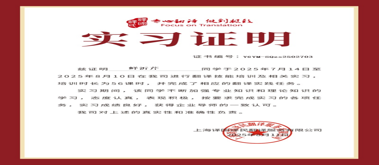 8月25日,太阳成集团tyc234cc职涯启航--职业梦想家队成员鲜沂芹完成译国译民翻译公司为期四周的线上实习,通过阶段性实践将理论转化为实用技能,积累了扎实的行业经验。