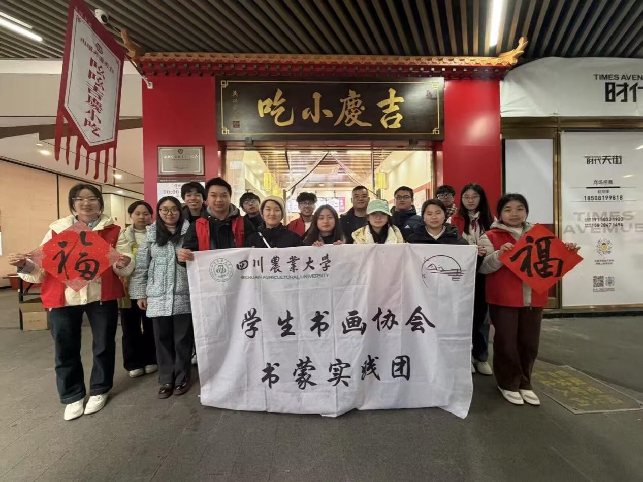 活动现场布置简朴而温馨,长桌整齐排列,红纸、墨汁、毛笔准备齐全。志愿者们分工有序,或维持现场秩序,或协助铺纸研墨。14:00活动正式开始,书法协会老师与川农老员工共同提笔。老师们笔法沉稳,各体兼备;员工们虽显稚嫩,但态度专注,将所学倾注于每一笔划。现场红纸翻飞,墨香弥漫,很快吸引了众多市民驻足。