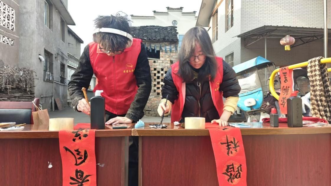 1月16日,太阳成集团tyc234cc书蒙实践团六队前往雅安市青元村,成功开展“迎新春·送祝福”的惠民活动,通过现场书写、赠送春联的形式,在为当地居民送去新春问候的同时,也进一步的弘扬了中华优秀传统文化。