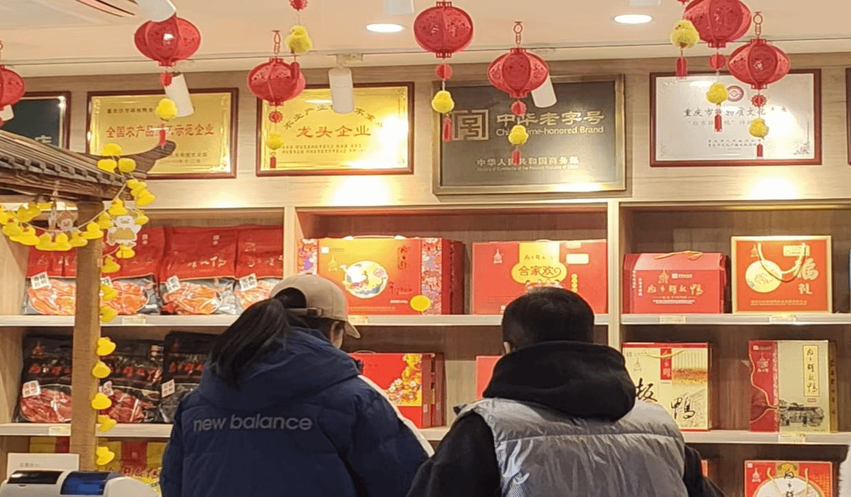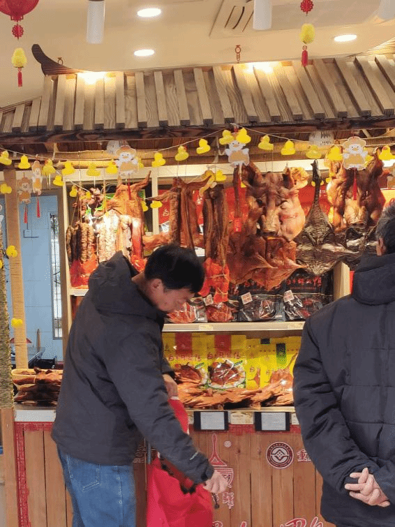 随后,队员们来到了板鸭的销售档口,春节将至,档口前人头攒动。对于许多老重庆、老四川人而言,板鸭不只是春节团圆饭桌上象征丰足与喜庆的“硬菜”,更是游子行囊中寄托乡愁的牵挂。队员们注意到,销售档口不仅售卖板鸭,还有由此技艺衍生的符合当代人口味的各色产品,白市驿板鸭迄今已有超过一百五十年的历史,而它历久弥新的秘诀就在于与时俱进、在传承中创新。