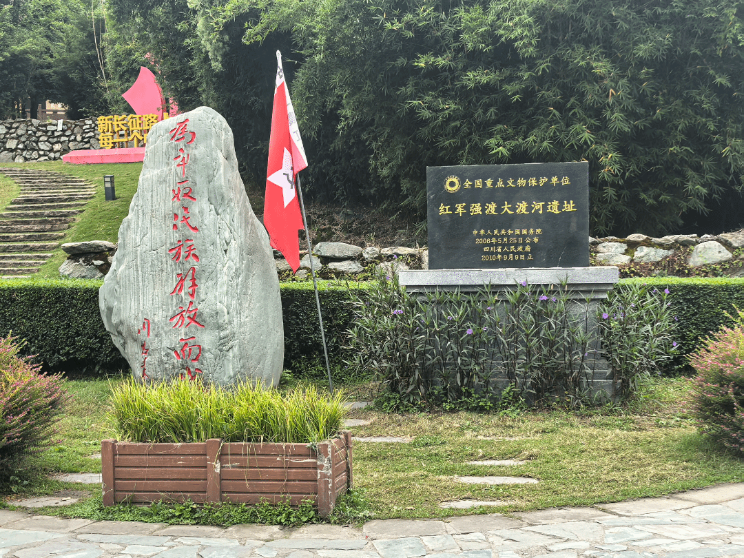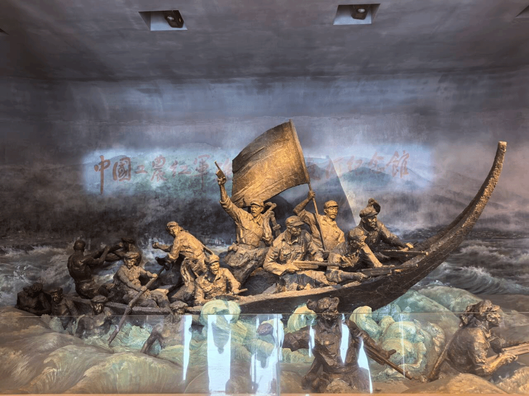 中国工农红军强渡大渡河纪念馆于2001年被中宣部命名为“全国爱国主义教育示范基地”,2006年被国务院批准公布为全国重点文物保护单位。小队进入馆内首先可以看到红军强渡大渡河的示意图,滔天的浪水拍打着船只,红军战士们面对的不仅是敌人的枪林弹雨,还面对着自然洪涛的挑战,从船上工农红军战士们的神情上小队队员便感受到了他们的孤注一掷和不畏艰险的勇气。