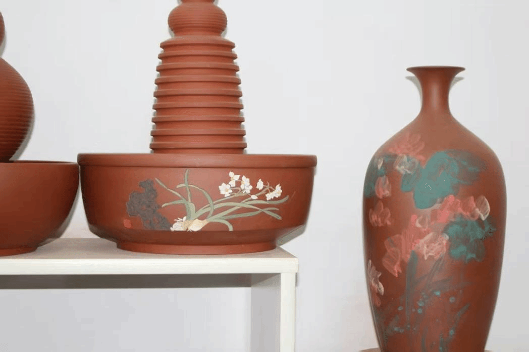活动当日,探索队首先参观了土陶艺术园的精品展厅与非遗工坊。在展厅中,层叠如古塔的创意陶瓶、绘有水仙纹样的传统陶盆、融合现代泼墨技法的彩绘瓷瓶等作品集中亮相,队员们近距离观察陶土肌理与纹样细节,结合专业背景分析水仙、荷花等纹饰所承载的古典文学意象。在非遗工坊,队员们全程观摩了揉泥、拉坯、修胎、烧制的传统工序,感受“土与火”淬炼出的东方美学。