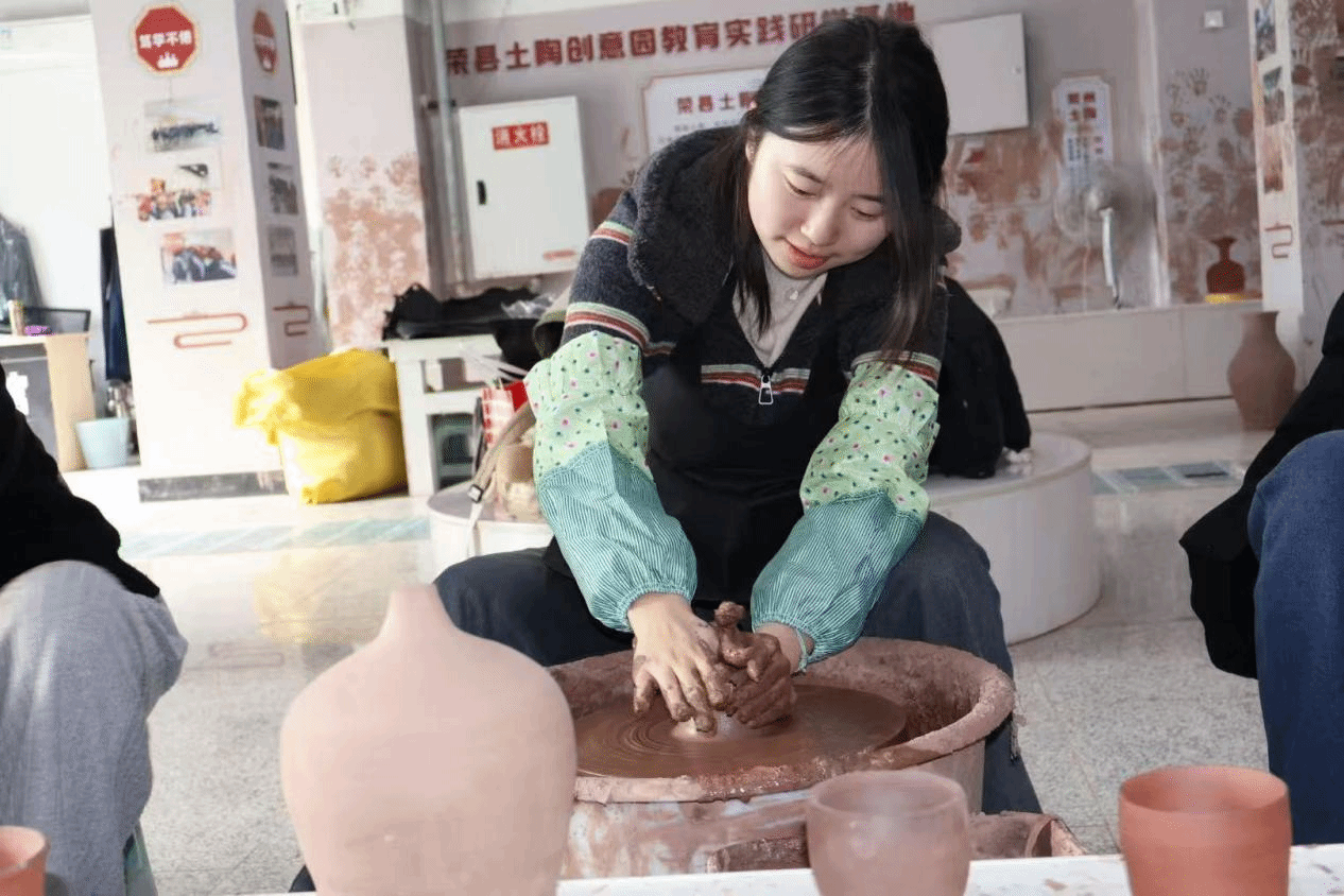 荣县土陶创意园是自贡市消费教育示范基地、哲学社会科学普及基地,四层展区涵盖土陶文创、非遗佳作、工业陶品及西部陶都精品,全方位展现荣县土陶的发展脉络与多元价值。此次实践以大师传艺为核心,深耕陶艺数十年的大师与非遗传承人化身指导老师,从揉泥控温、拉坯塑形的基础技法,到利坯修型、上釉配色的关键要点,再到烧制把控的核心门道,逐一细致讲解。针对队员实操中的手法偏差、细节问题,大师们及时答疑解惑、亲手纠正,让队员们快速掌握陶瓷制作完整流程与核心技巧,真切感受传统制陶技艺的精妙与匠人的坚守。