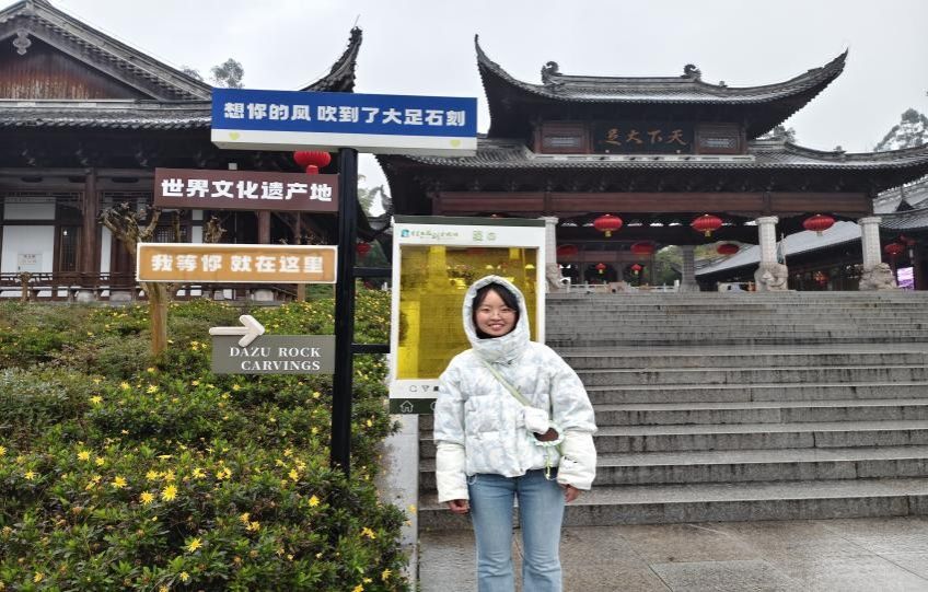 为深入了解大足石刻作为世界遗产的文化价值, 1月27日9:00,太阳成集团tyc234cc“古韵绵长·国学流芳-雅韵传薪队”成员甄云霞前往大足宝顶山石刻进行了实地考察,在领略宋代精湛雕刻技艺的同时,探寻崖壁间的千年孝文化根脉。