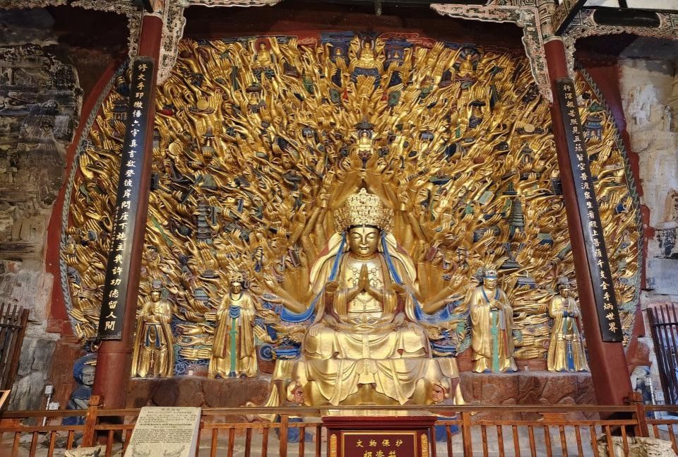 首先成员甄云霞沿着路线依次参观了《牧牛图》,《六道轮回图》,《广大宝楼阁图》,《华严三圣像》,当行至千手观音造像时,整座造像的气势让人挪不开眼。作为大足石刻“国宝中的国宝”,1007只手,手势多样,无一雷同,细微到指尖的弧度、器物上的窗棂纹路,都雕刻得清晰可辨。历经八百余年风雨,经现代文物保护“一号工程”修复后,百万张金箔让造像重焕金光,熠熠生辉。这尊造像不仅是艺术的巅峰,更融合了儒释道三教思想,其慈悲内核与中华传统仁爱观念深度契合,成为跨越时空的精神象征。