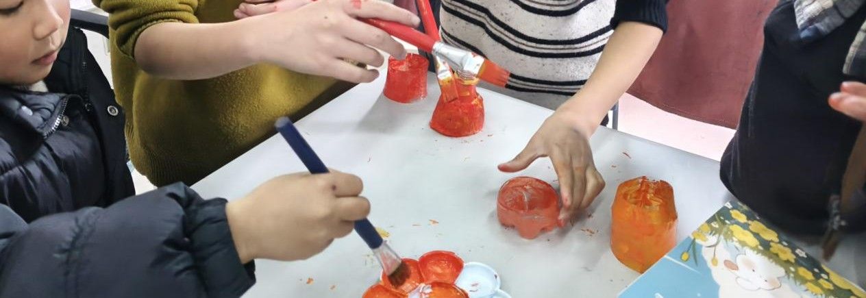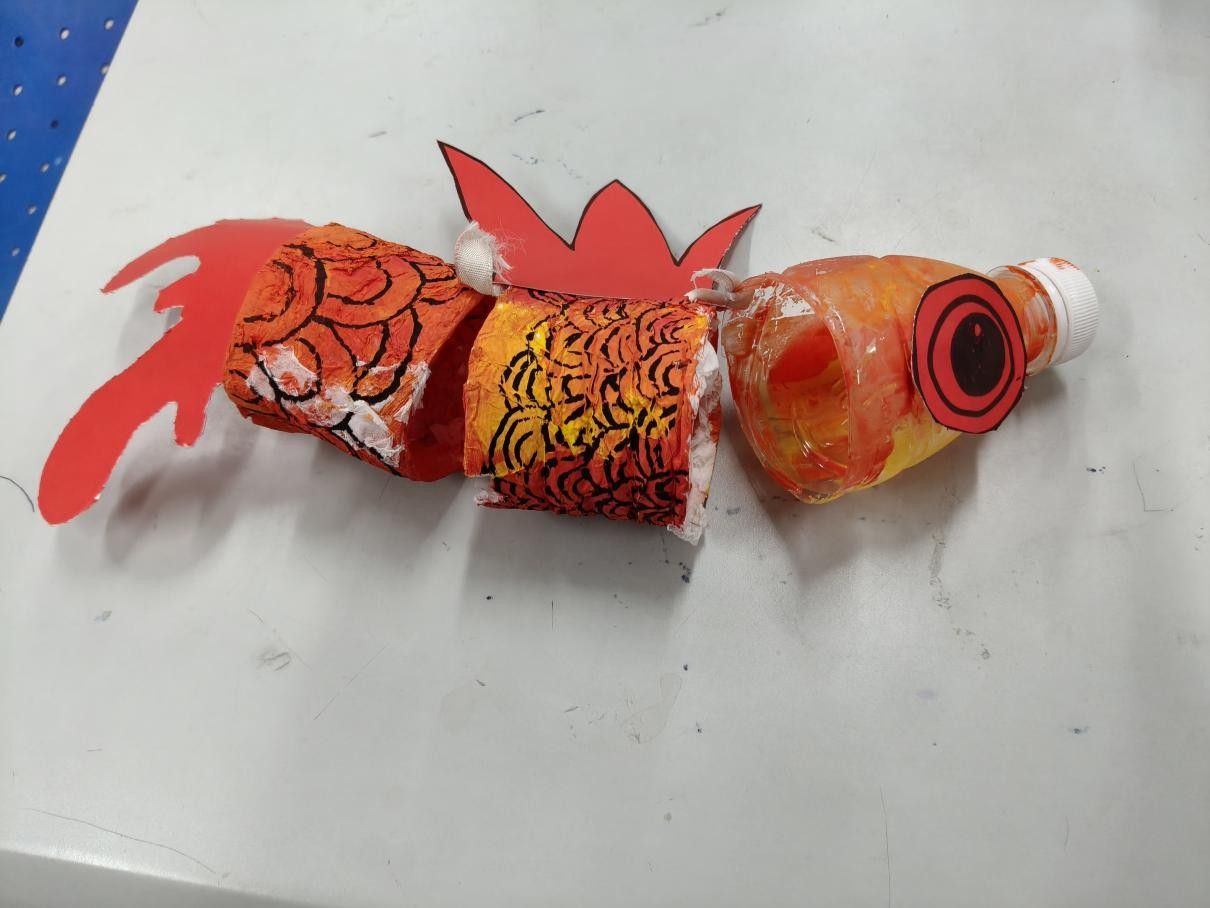 活动现场,团队成员以步骤化教学引导孩子们完成鱼灯制作。首先,主讲人与队员协作,将塑料瓶均匀剪为三等分,在瓶身外侧粘贴一圈纸张并刷胶固定,为后续上色打好基底;其次,孩子们手持画笔,以红色、黄色为主色调为瓶身涂刷颜料,勾勒鱼灯基础形态;最后,大家用手工绳将三段构件拼接成型,搭配彩绳、亮片等小装饰,完成个性化鱼灯作品。整个过程循序渐进,孩子们在动手实践中掌握基础制作技巧,体验传统手工艺的创作乐趣。